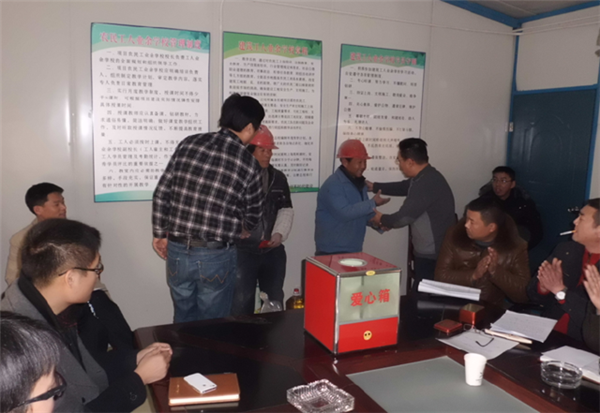 園區(qū)公舍三期西楚金地和白領(lǐng)公寓項(xiàng)目是今年園區(qū)的重點(diǎn)工程,為創(chuàng)建文明工地,構(gòu)建和諧園區(qū),營(yíng)造關(guān)愛幫扶、互助互濟(jì)的良好氛圍,自開工以來(lái),項(xiàng)目部辦公室就設(shè)立了募捐箱,并在元旦即將到來(lái)之際,用募集到的善款幫助工地上生活困難的建筑工人,讓困難工人群體感受到社會(huì)的溫暖和正能量,增強(qiáng)其歸屬感,在工地、在園區(qū)也能感受到家的溫馨。