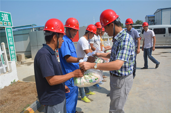8月14日上午,開(kāi)發(fā)公司副總裁劉建華帶隊(duì)來(lái)到園區(qū)派出所、夢(mèng)家園、許莊變、2014年市政二標(biāo)、生產(chǎn)力中心等項(xiàng)目工地,現(xiàn)場(chǎng)慰問(wèn)奮戰(zhàn)在高溫一線(xiàn)的企業(yè)員工和建筑工人,并親自給他們遞上了毛巾、肥皂、洗發(fā)水、清涼油等防暑降溫物品。
