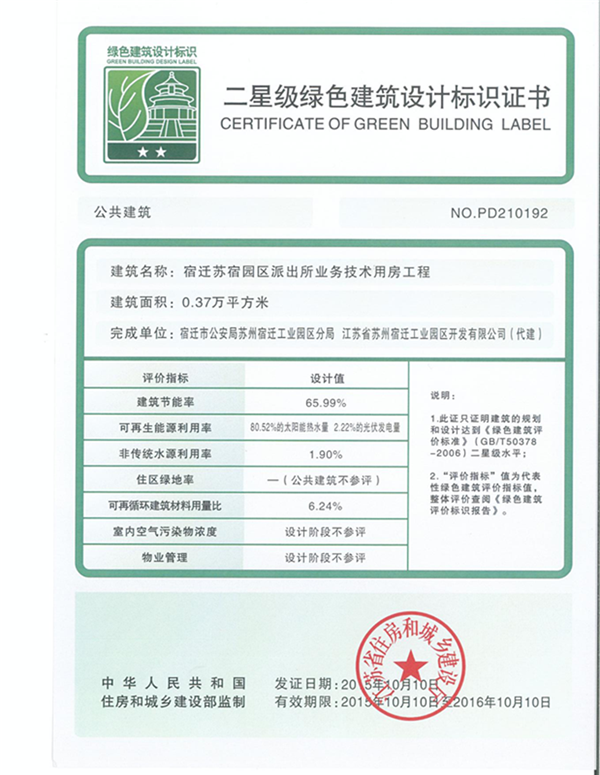 近日,由開(kāi)發(fā)公司代建的蘇宿園區(qū)派出所業(yè)務(wù)技術(shù)用房工程,順利通過(guò)國(guó)家二星級(jí)綠色建筑設(shè)計(jì)標(biāo)識(shí)認(rèn)證。