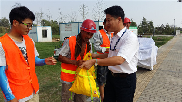 7月28日下午,開發(fā)公司副總裁劉建華帶領(lǐng)公司相關(guān)部門負(fù)責(zé)人來到公司代建項(xiàng)目工地,現(xiàn)場慰問了奮戰(zhàn)在高溫一線的企業(yè)員工和建筑工人,并親自給他們遞上了毛巾、肥皂、清涼油等防暑降溫物品。