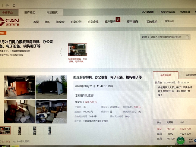 8月21日上午10時,城發(fā)公司報廢廚具、辦公設(shè)備、電子設(shè)備、鋼構(gòu)棚子等物資網(wǎng)上拍賣開始,7家競買人,經(jīng)過1小時44分10秒244次的緊張激烈競價,最終以228700元成交標的,比評估價90200元高出138500元,溢價率153.55%。