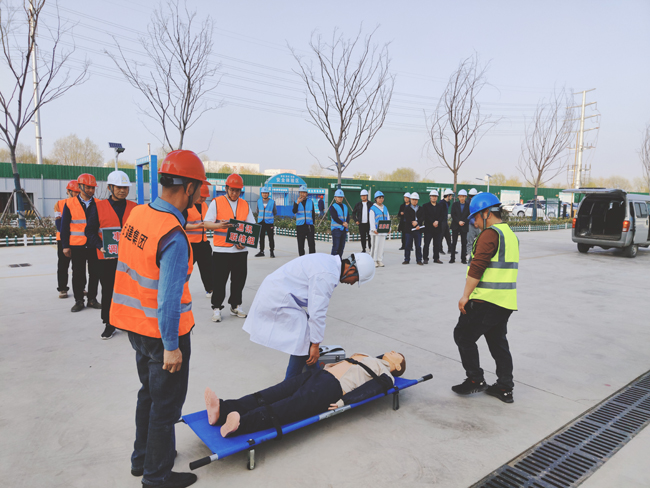 本次演練共分6個小組,分別為:現場模擬組、現場警戒(搶修)組、應急救援(疏散)組、通訊聯(lián)絡組、事故調查組、 觀摩組。假設工人在生活區(qū)違規(guī)使用大功率電器突發(fā)火災,被煙霧和火勢圍困,二樓有人發(fā)出救援信號,正在附近巡查的安全員發(fā)現情況后,立即趕赴現場并打電話給項目生產負責人,在接到通知后,項目生產負責人迅速安排項目部應急救援辦公室負責人,并啟動應急預案,各救援小組立即到達現場開展工作,安全員迅速引導全體人員有序從疏散樓梯疏散到安全位置,救援組帶著擔架、急救箱等趕赴現場,將“受傷”人員用擔架從房內撤離到安全位置,同時救援醫(yī)生對“受傷”人員進行簡單的心肺復蘇、人工呼吸,并迅速送往醫(yī)院進行治療。