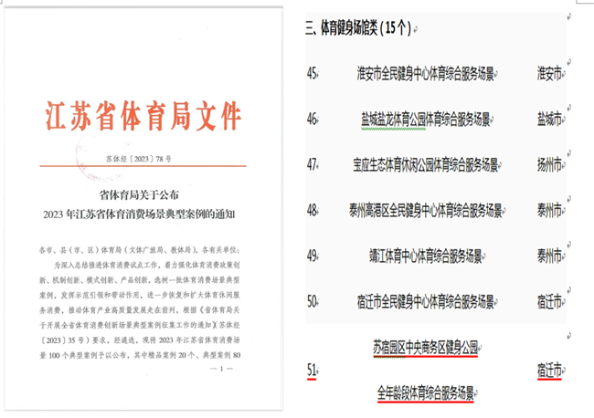 近日,江蘇省體育局印發(fā)《關(guān)于公布2023年江蘇省體育消費(fèi)場景典型案例的通知》,遴選公布100個體育消費(fèi)場景典型案例,其中精品案例20個、典型案例80個。蘇宿園區(qū)中央商務(wù)區(qū)健身公園全年齡段體育綜合服務(wù)場景入選2023年江蘇省體育消費(fèi)場景典型案例。
