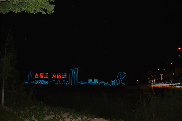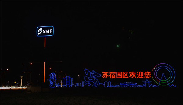 在園區(qū)東入口為民河的一畔,一座座生動(dòng)的城市剪影燈光造型在青海湖西路兩側(cè)一字排開(kāi)。有象征著新加坡元素的“魚(yú)尾獅”,有蘇州工業(yè)園區(qū)金雞湖畔的東方之門(mén)、摩天輪和李公堤,還有西楚霸王項(xiàng)羽騎馬的颯爽英姿。造型以蘇州、宿遷和新加坡城市建筑輪廓線、城市主題雕塑為基本元素,以剪影形式為載體,以現(xiàn)代高科技LED燈光為表現(xiàn)手段,通過(guò)炫麗動(dòng)感的光影效果,在夜色中描繪出了一副靚麗多姿的畫(huà)卷,生動(dòng)地展現(xiàn)出了園區(qū)“從新加坡到蘇州再到宿遷”和“在宿遷、為宿遷”的發(fā)展理念。